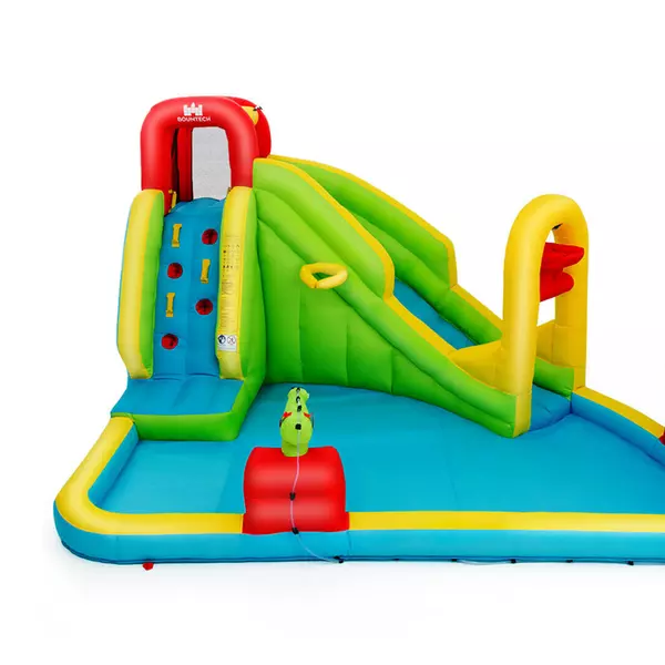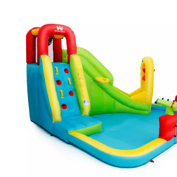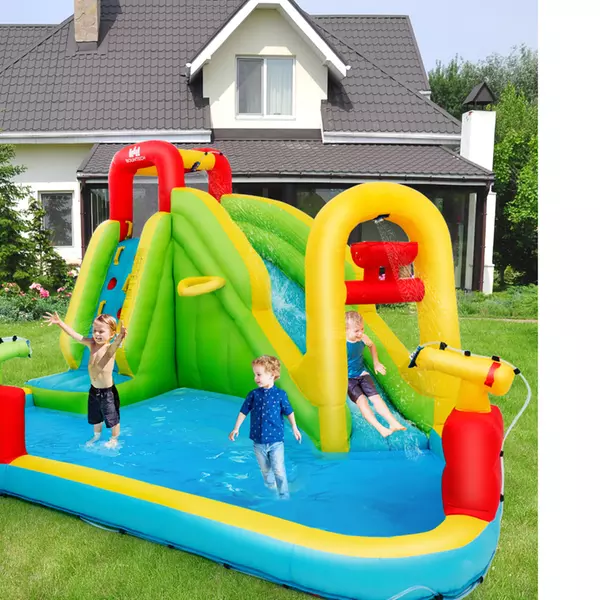This inflatable water park features a slide, a splash pool, a climbing wall, a built-in basketball rim and two water cannons. Children can not only enjoy multiple pleasures, but also exercise their balance. The mesh walls around the connecting area(between climbing wall and slide) ensure the children’s safety while playing and satisfies the ventilation requirement well. Come with a hose, the inflatable castle can be used as a water park to make children feel cool even on the hottest summer. Made of wear-resistant oxford materials , it is durable enough to accompany children a long time. In addition, with a carry bag , you can take the inflatable water slide to anywhere you want and other sweet accessories also give you some help.